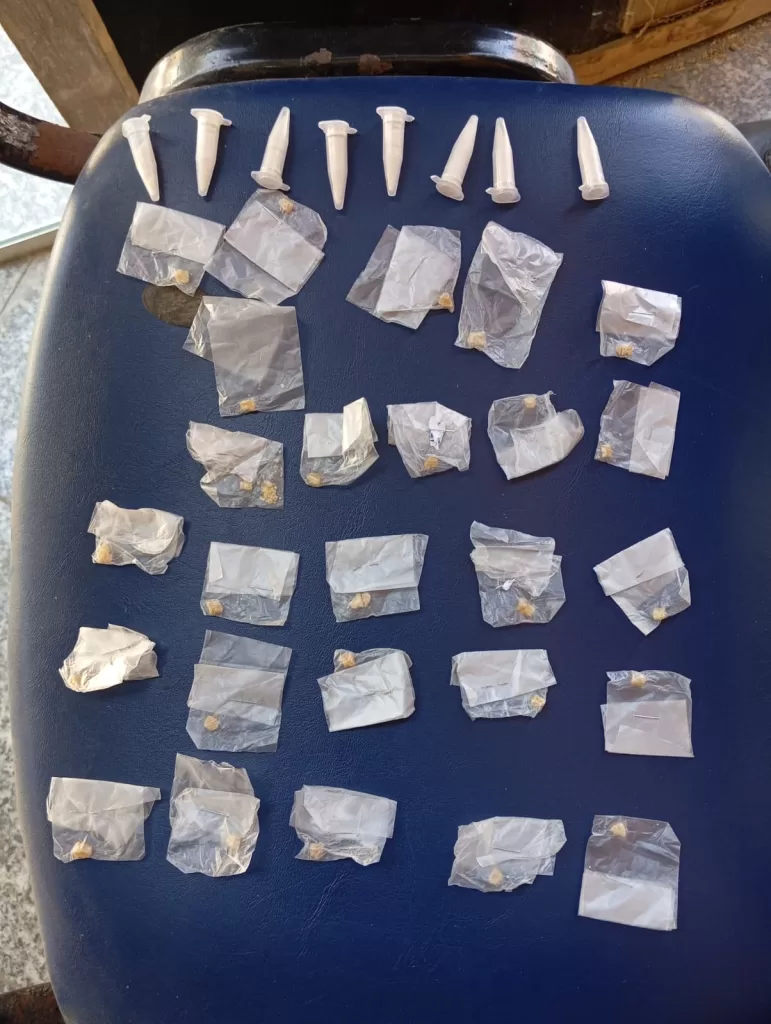 Após um trabalho de inteligência, os agentes chegaram ao local e encontraram uma quantidade significativa de entorpecentes. Foram apreendidas 575 buchas de maconha, 22 vidros de loló e uma balança de precisão, equipamento comumente utilizado para o fracionamento de drogas.