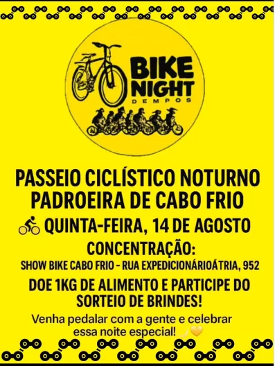 Nesta quinta-feira (14), acontece mais uma edição do Bike Night, um passeio ciclístico noturno pelas ruas de Cabo Frio, em celebração à Padroeira da cidade. A concentração será às 19h, em frente à Loja Show Bike, no bairro São Cristóvão.