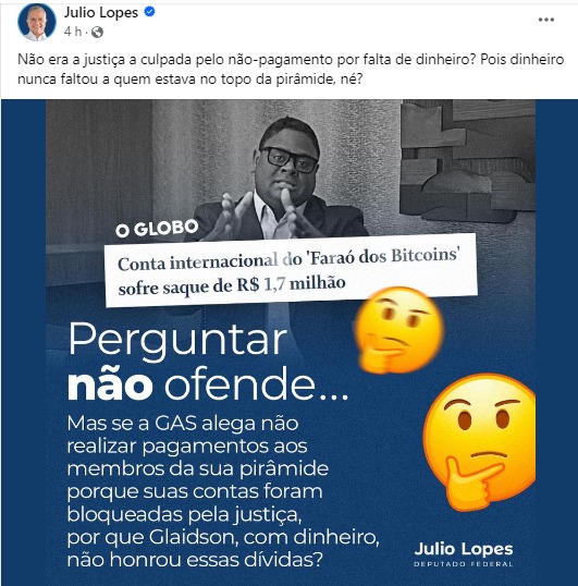 O deputado federal Julio Lopes (PP), da CPI das Pirâmides – encerrada mês passado -, fez um questionamento, nesta quarta-feira (1º), em suas redes sociais, que é o que todos os lesados do grupo GAS, e até mesmo os que não caíram no golpe, querem saber. Se Glaidson Acácio, o faraó dos bitcoins, afirma que não pode pagar os investidores porque a justiça bloqueou seus bens, quem explica os saques que, de quando em vez, acontecem na conta do ex-garçom? “Não era a justiça a culpada pelo não-pagamento por falta de dinheiro? Pois dinheiro nunca faltou a quem estava no topo da pirâmide, né?”, perguntou Lopes. A CPI foi encerrada mês passado com a votação de um relatório final que pediu indiciamento de 45 pessoas.
