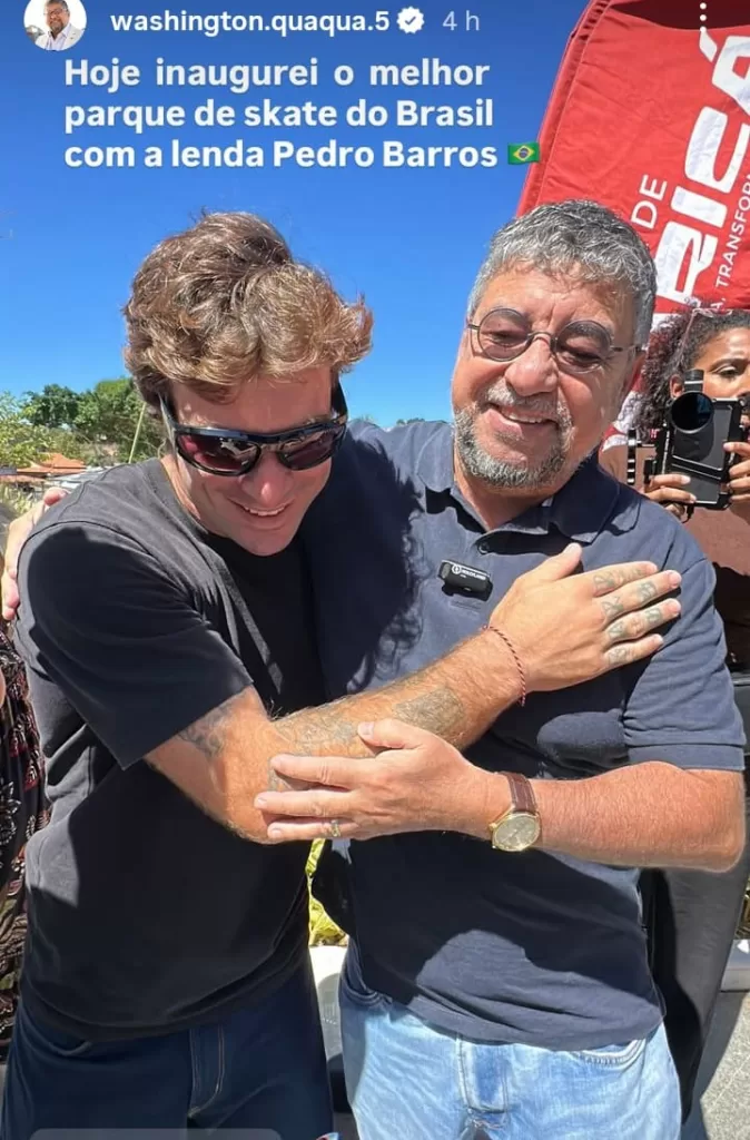 O prefeito de Maricá, Washington Quaquá, inaugurou nesta quarta-feira (3) a Pista de Skate Chorão, no bairro Boqueirão, considerada uma das maiores e mais completas do estado. O espaço reúne as modalidades Street, Downhill e Park e homenageia Alexandre Abrão, o Chorão, falecido vocalista do Charlie Brown Jr. Na cerimônia, Quaquá anunciou a expansão de núcleos de skate em diferentes bairros e defendeu a criação de escolas para a prática do esporte. O evento reuniu mais de 40 atletas locais e contou com a presença do campeão mundial e medalhista olímpico Pedro Barros – com ele na imagem -, que destacou a importância da pista para o desenvolvimento humano e esportivo dos jovens. O secretário de Esportes, Filipe Bittencourt, reforçou que o equipamento já é reconhecido como referência no estado e será fundamental para o fortalecimento do skate no município.
