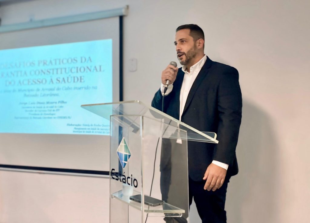 O secretário de Saúde de Arraial do Cabo, Jorge Diniz, participou nesta terça-feira (7) da Semana Acadêmica Nacional de Ciências Jurídicas, promovida pela Universidade Estácio de Sá. Segundo os organizadores, o evento tem como objetivo trabalhar a formação socioemocional como projeto de vida e carreira. A atividade desta terça reuniu alunos e professores dos cursos de Direito, Farmácia e Fisioterapia. A palestra de Jorge Diniz abordou o tema “Desafios práticos da garantia constitucional do acesso à saúde”. De forma simples e clara, Diniz explicou, em linhas gerais, como funciona o SUS e destacou desafios como as diferenças marcantes do Brasil para o atendimento à população, desde os grandes centros até os lugares mais remotos, mostrando como exemplo as populações ribeirinhas no interior do país, onde o acesso pode ser difícil e demorado.