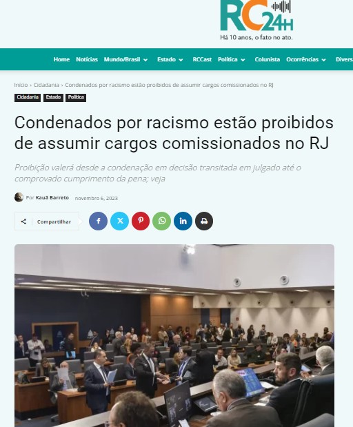 As pessoas condenadas por crimes de preconceito de raça e cor, previstos na Lei Federal 7.716/89, não poderão ser nomeadas para cargos em comissão de livre nomeação e exoneração. É o que prevê a Lei 10.155/23, de autoria original do deputado Carlinhos BNH (PP), sancionada pelo governador Cláudio Castro (PL) e já publicada no Diário Oficial. A proibição valerá desde a condenação em decisão transitada em julgado até o comprovado cumprimento da pena. Na justificativa do texto, o autor aponta que, segundo dados do Instituto de Segurança Pública (ISP), em 2021, foram registradas 1.365 ocorrências de injúria por preconceito em todo o estado, sendo 1.036 delas vítimas negras. Também assinam o projeto como coautores os deputados Índia Armelau (PL), Martha Rocha (PDT), Luiz Paulo (PSD), Tia Ju (REP), Franciane Motta (União), Átila Nunes (MDB), Tande Vieira (PP), Lucinha (PSD), Carlos Minc (PSB), Brazão (União), Marcelo Dino (PL), Rodrigo Amorim (PTB) e Andrezinho Ceciliano (PT).