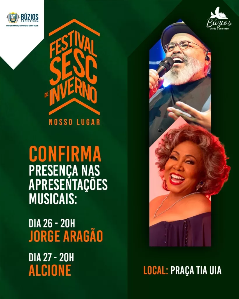 A 23ª edição do Festival Sesc de Inverno, um dos mais importantes eventos multilinguagens do país, divulgou nesta terça-feira (1º) a programação musical do evento, que será realizado nos dias 26 e 27 de julho, na Praça Tia Uia, na Rasa, em Búzios. As principais atrações, são os consagrados sambistas Jorge Aragão e Alcione.