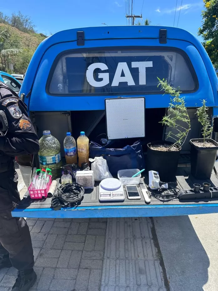 De acordo com a polícia, a denúncia informava que o suspeito estaria traficando drogas no portão de sua residência. No local, foram encontradas duas plantas de cannabis, seis frascos de lança perfume, uma balança de precisão, quatro litros de fortificante, um refletor de iluminação, um aparelho celular, uma faca e material para endolação.