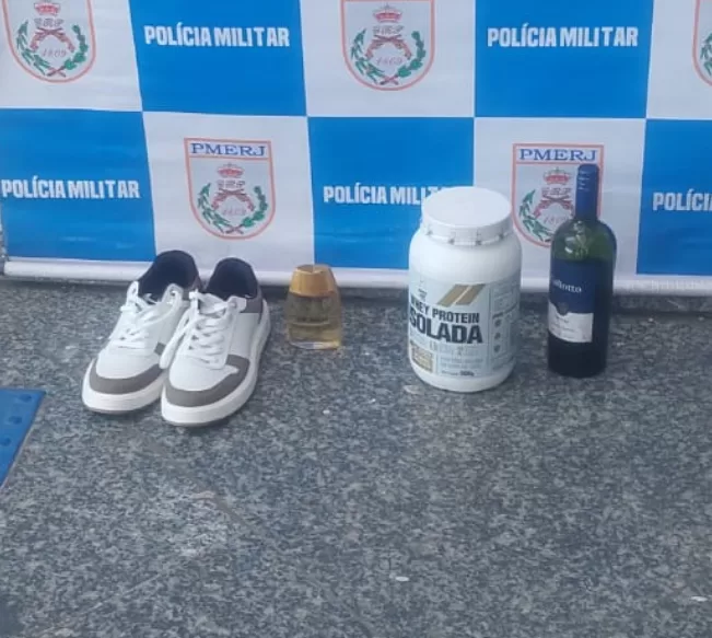 No chão, próximo ao suspeito, estavam os itens furtados: uma garrafa de vinho da marca Galiotto (do Supermarket), um par de tênis e um frasco de perfume (ambos da Renner) e um pote de whey protein (da Drogaria do Povo). Os produtos foram reconhecidos pelas lojas e apreendidos pela equipe policial.