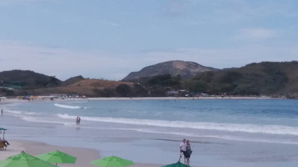 Apesar da manhã nublada, a Praia do Forte já recebe alguns banhistas e visitantes que aproveitam o sol fraco. A água tem temperatura média de 22°C e ondas abaixo de um metro.