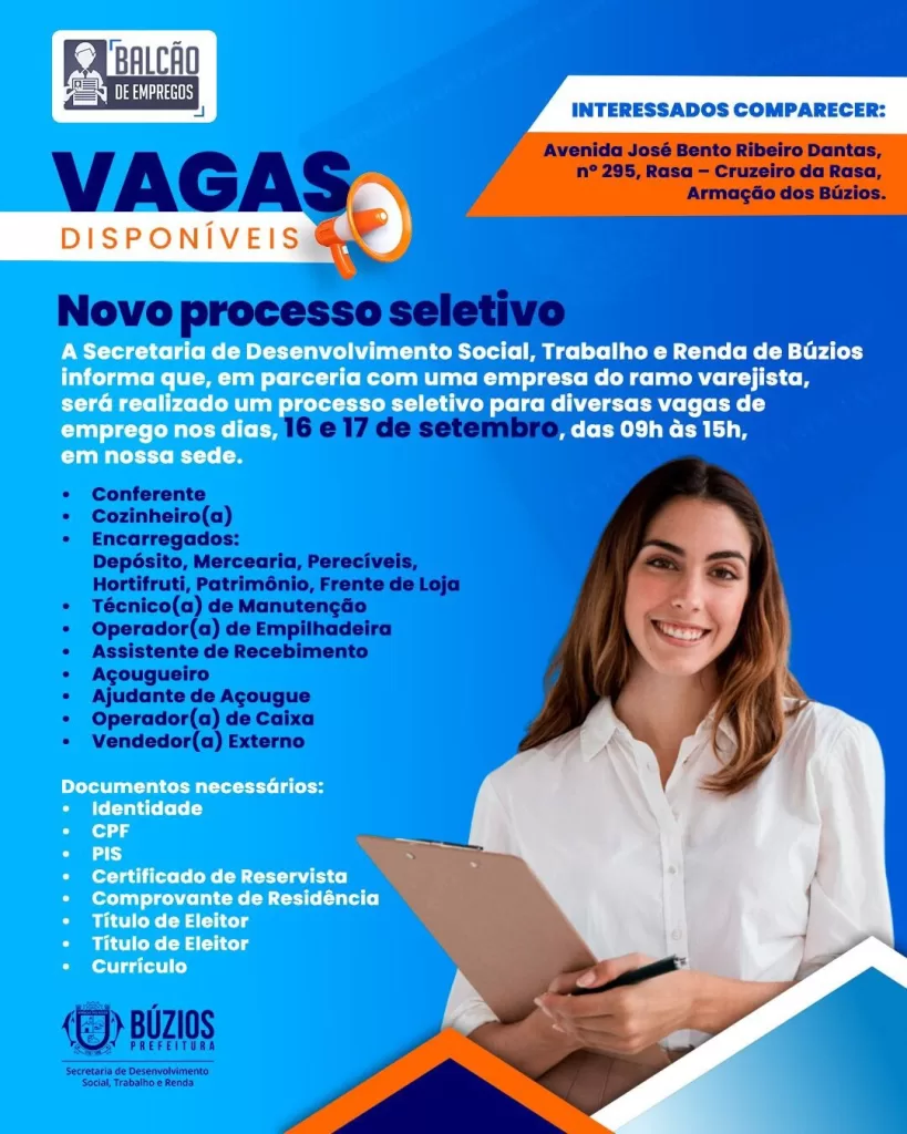 A Prefeitura de Armação dos Búzios está realizando um processo seletivo para diversas vagas de emprego. As entrevistas acontecem nesta terça (16) e quarta-feira (17), das 9h às 15h, na sede da Secretaria de Desenvolvimento Social, Trabalho e Renda.
