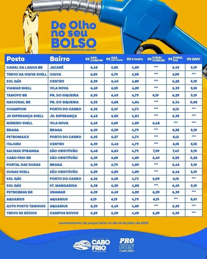 O Procon de Cabo Frio realizou nesta quarta-feira (16) uma nova etapa do levantamento mensal de preços praticados nos postos de combustíveis do município. A ação ocorreu nos distritos do Centro e de Tamoios, abrangendo 22 estabelecimentos. Durante a fiscalização, os agentes conferiram os valores cobrados pelo litro da gasolina comum, gasolina aditivada, etanol e diesel, além do metro cúbico do GNV.