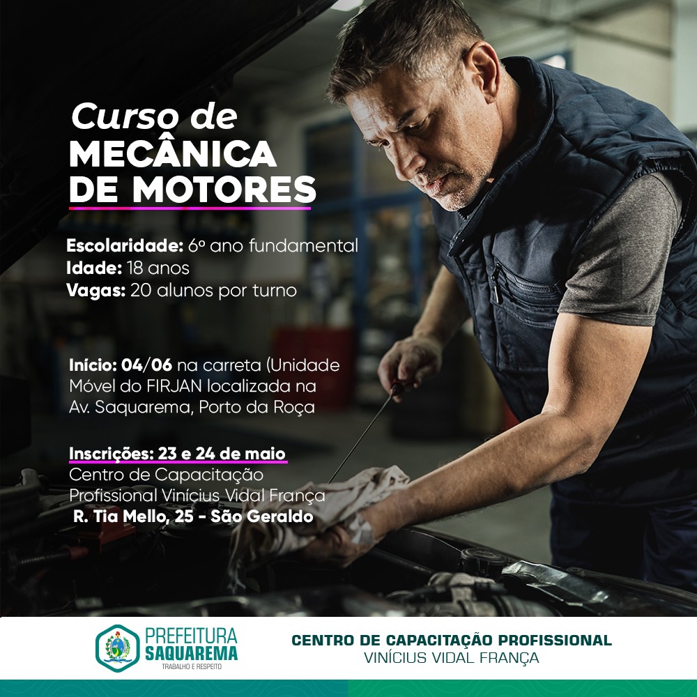 O município de Saquarema vai abrir inscrições para o curso de Mecânica de Motores Ciclo Otto (Automotivo), que será realizado na Unidade Móvel do SENAI e em parceria com a FIRJAN, no bairro Porto da Roça. As inscrições serão entre quinta (23) e sexta-feira (24), na secretaria do Centro de Capacitação, no bairro São Geraldo.