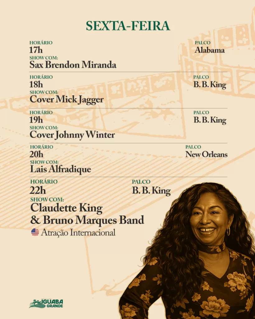 Entre os artistas internacionais confirmados estão Lorenzo Thompson e Claudette King, filha do músico norte-americano B.B. King. As apresentações dos dois cantores estão marcadas para a noite de sábado, no Palco Principal, com repertório voltado ao blues.